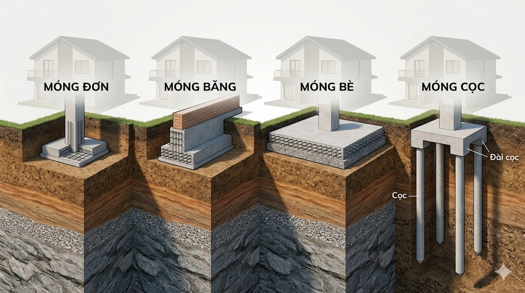 Không có loại móng nào là "tốt nhất", chỉ có loại móng phù hợp nhất với công trình của bạn. Dựa trên kết quả khảo sát địa chất, kiến trúc sư sẽ tư vấn cho bạn một trong các loại móng phổ biến: